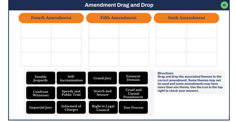 Page:Resources LibraryArrow iconCurriculum:Government and Politics: Civics for the American ExperimentArrow iconUnit:Unit 7: Civil Rights and Civil LibertiesAmendments Four, Five and Six InteractiveA card sorting interactive that helps students define the fourth, fifth and sixth amendments.