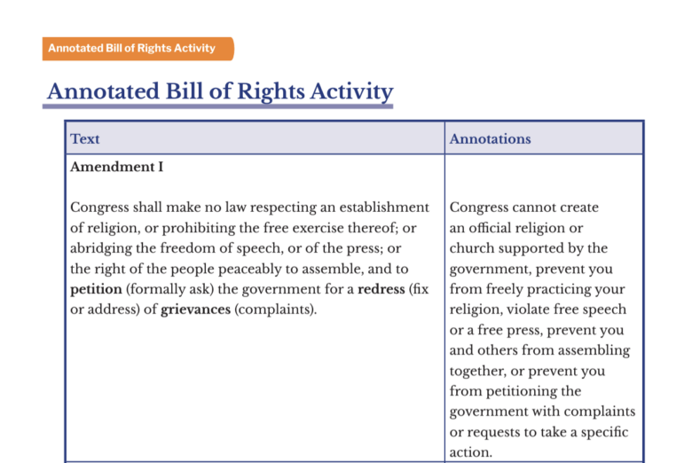 Congress shall make no law respecting an establishment of religion, or prohibiting the free exercise thereof; or abridging the freedom of speech, or of the press; or the right of the people peaceably to assemble, and to petition (formally ask) the government for a redress (fix or address) of grievances (complaints).