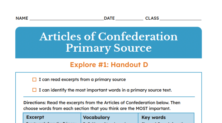 Page:Resources LibraryArrow iconCurriculum:ElementaryArrow iconLesson:Consequences of the American Revolution Articles of Confederation Scaffolded Primary Source | ElementaryA scaffolded version of the document to help students gain detailed understanding.