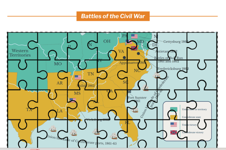 Page:Resources LibraryArrow iconCurriculum:Building a Self-Governing People: Civics & US History for Middle SchoolArrow iconUnit:Unit 8: Civil War (1860-1865)Arrow iconLesson:Battles of the Civil War Lesson PlanBattles of the Civil War MapAn interactive way for students to interpret and synthesize information from historical maps.