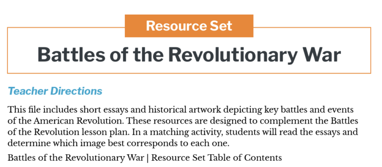 Page:Resources LibraryArrow iconCurriculum:Building a Self-Governing People: Civics & US History for Middle SchoolArrow iconUnit:Unit 2: American Revolution (1763-1783)Arrow iconLesson:Battles of the RevolutionBattles of the Revolutionary War Resource SetSix images and six essays that review the major battles of the Revolutionary War.