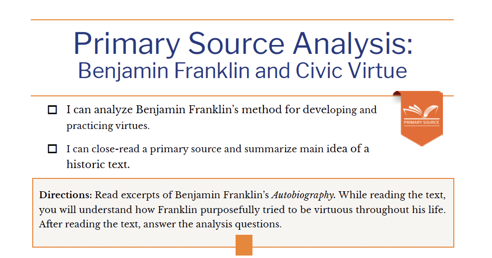 Directions: Read excerpts of Benjamin Franklin’s Autobiography. While reading the text, you will understand how Franklin purposefully tried to be virtuous throughout his life. After reading the text, answer the analysis questions.