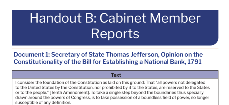 A set of primary sources written by Thomas Jefferson, Edmund Randolph, and Alexander Hamilton that share their opinions on the Constitutionality of the National Bank.