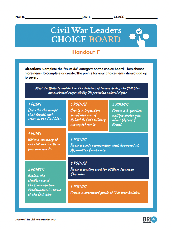 Page:Resources LibraryArrow iconCurriculum:ElementaryArrow iconLesson:Course of the Civil WarCivil War Leaders Activity | ElementaryA handout to help students understand the key leaders on each side of the Civil War.