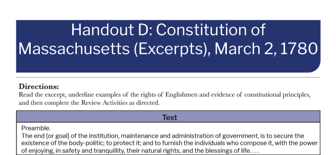 Excerpts of the Massachusetts Constitution that ask students to underline examples of the rights of Englishmen and evidence of constitutional principles, and then complete the Review Activities as directed.