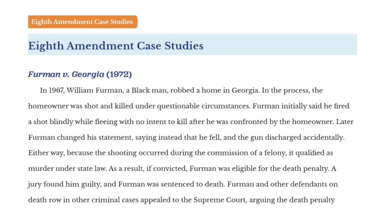 In 1967, William Furman, a Black man, robbed a home in Georgia. In the process, the homeowner was shot and killed under questionable circumstances. Furman initially said he fired a shot blindly while fleeing with no intent to kill after he was confronted by the homeowner. Later Furman changed his statement, saying instead that he fell, and the gun discharged accidentally. Either way, because the shooting occurred during the commission of a felony, it qualified as murder under state law. As a result, if convicted Furman was eligible for the death penalty. A jury found him guilty, and Furman was sentenced to death. Furman and other defendants on death row in other criminal cases appealed to the Supreme Court, arguing the death penalty was unconstitutional. They insisted that in their cases, the death penalty violated the Eighth Amendment’s ban on cruel and unusual punishment.