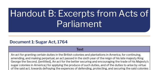 Page:Resources LibraryArrow iconCurriculum:Life, Liberty, and the Pursuit of HappinessArrow iconUnit:Chapter 3: 1763-1789Arrow iconLesson:Acts of ParliamentExcerpts from Acts of ParliamentExcepted text of seven acts of Parliament between the years of 1764-1774.