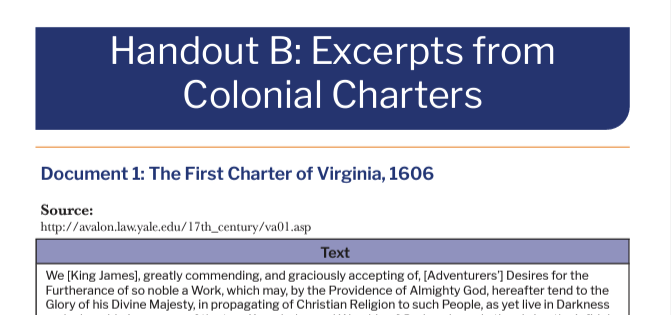 Page:Resources LibraryArrow iconCurriculum:Life, Liberty, and the Pursuit of HappinessArrow iconUnit:Chapter 2: 1607-1763Arrow iconLesson:Colonial Comparison: The Rights of EnglishmenExcerpts from Colonial ChartersFour primary sources from the 1600's that showcase the Colonist's understanding of government.