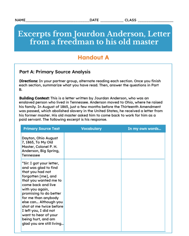 Excerpts from Jourdon Anderson Letter | Elementary
