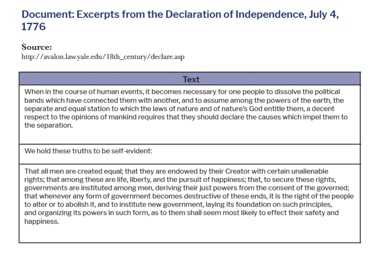 Excerpts of the Declaration of Independence and comprehension questions that explore the principles of individual rights, democracy, freedom, and self-government.