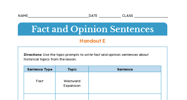 Page:Resources LibraryArrow iconCurriculum:ElementaryArrow iconLesson:ExpansionFact vs. Opinion Sentences | ElementaryPrompts that guide students to write fact and opinion sentences about historical topics from the lesson.