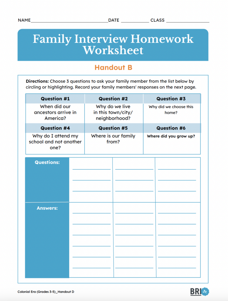 A homework assignment where students interview a family member to learn more about how their family arrived at their current place.