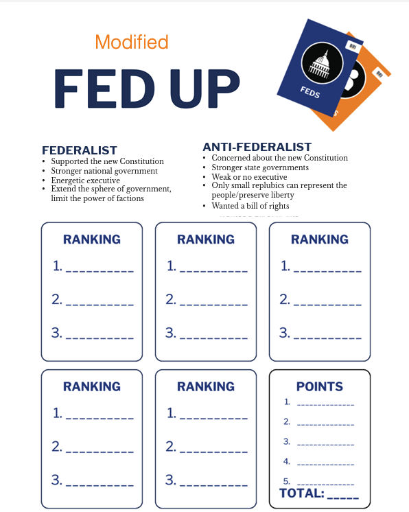 Page:Resources LibraryArrow iconCurriculum:Building a Self-Governing People: Civics & US History for Middle SchoolArrow iconUnit:Unit 3: Constitution and Ratification 1787-1791Fed Up Student HandoutA handout to accompany the whole class version of the Fed Up Game.