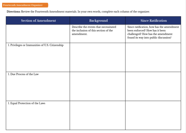 Directions: Review the Fourteenth Amendment materials. In your own words, complete each column of the organizer.