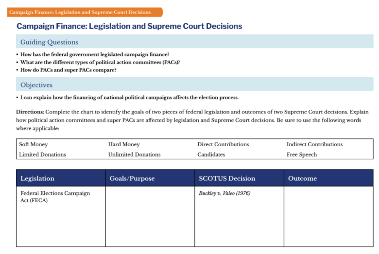 Directions: Complete the chart to identify the goals of two pieces of federal legislation and outcomes of two Supreme Court decisions. Explain how political action committees and superPACs are affected by legislation and Supreme Court decisions. Be sure to use the following words where applicable: