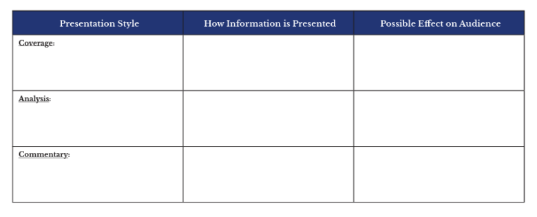 An activity to engage students with the ideas surrounding how the media presents information and how it affects how people participate and interact.