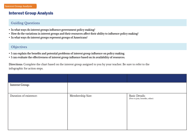 Page:Resources LibraryArrow iconCurriculum:Government and Politics: Civics for the American ExperimentArrow iconUnit:Unit 6: Political Participation and ElectionsArrow iconLesson:Interest Groups at WorkGraphic Organizer: Interest Group AnalysisA discovery activity to help students how various interest groups influence civil society.