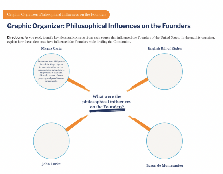 Page:Resources LibraryArrow iconCurriculum:Government and Politics: Civics for the American ExperimentArrow iconUnit:Unit 1: Foundation of American Self-GovernmentGraphic Organizer Philosophical Influences on the FoundersAn activity to help students explore the words of John Locke and Baron de Montesquieu.