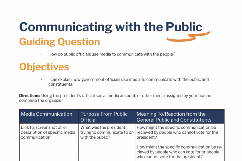 Page:Resources LibraryArrow iconLesson:How Officials Use the MediaGraphic Organizer: Presidential Social Media AnalysisAn activity that asks students to evaluate the ways the U.S. President uses social media.