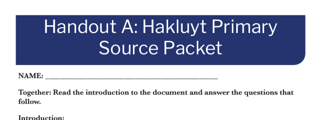 Page:Resources LibraryArrow iconCurriculum:Life, Liberty, and the Pursuit of HappinessArrow iconUnit:Chapter 1: 1491-1607Arrow iconLesson:Richard Hakluyt and the Case for Undertaking Sea VoyagesHakluyt Primary Source PacketPrimary Sources and questions to give students insight into Richard Hakluyt.