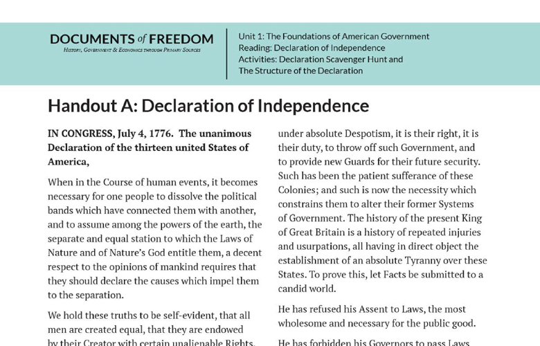 Page:Resources LibraryArrow iconCurriculum:Documents of FreedomArrow iconUnit:The Foundations of American GovermentArrow iconLesson:The Declaration of Independence – Docs of FreedomHandout A: Declaration of Independence 2