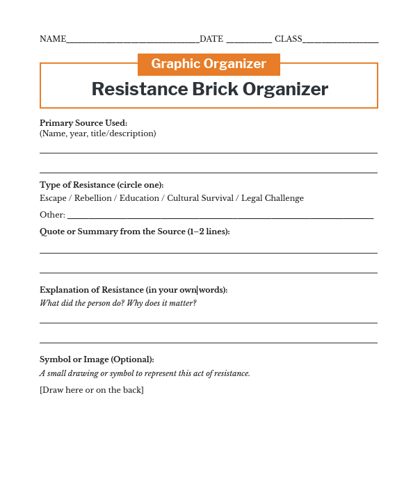 Page:Resources LibraryArrow iconCurriculum:Building a Self-Governing People: Civics & US History for Middle SchoolArrow iconUnit:Unit 7: American Expansion (1830-1860)Arrow iconLesson:How Enslaved People Resisted SlaveryHow Enslaved People Resisted Slavery Graphic OrganizerA student handout to accompany the primary sources in this lesson.
