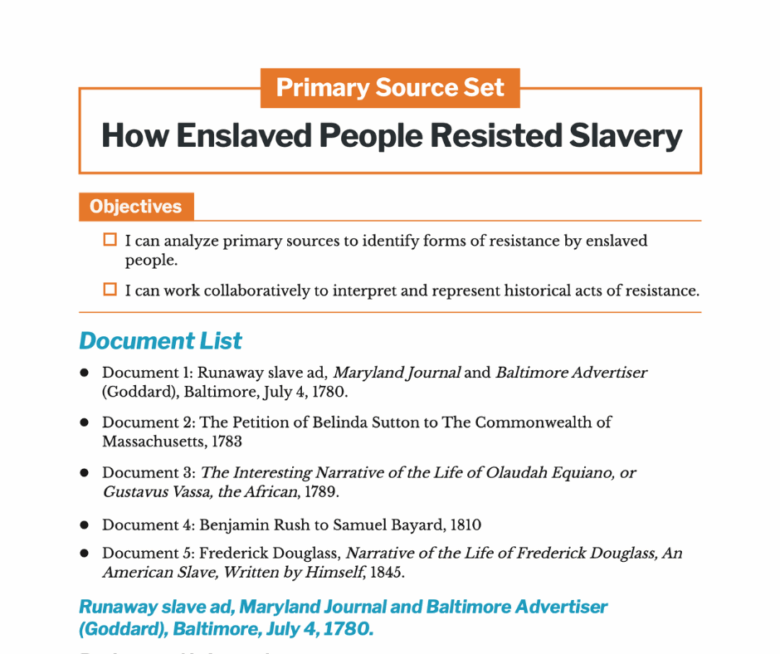 - I can analyze primary sources to identify forms of resistance by enslaved people.