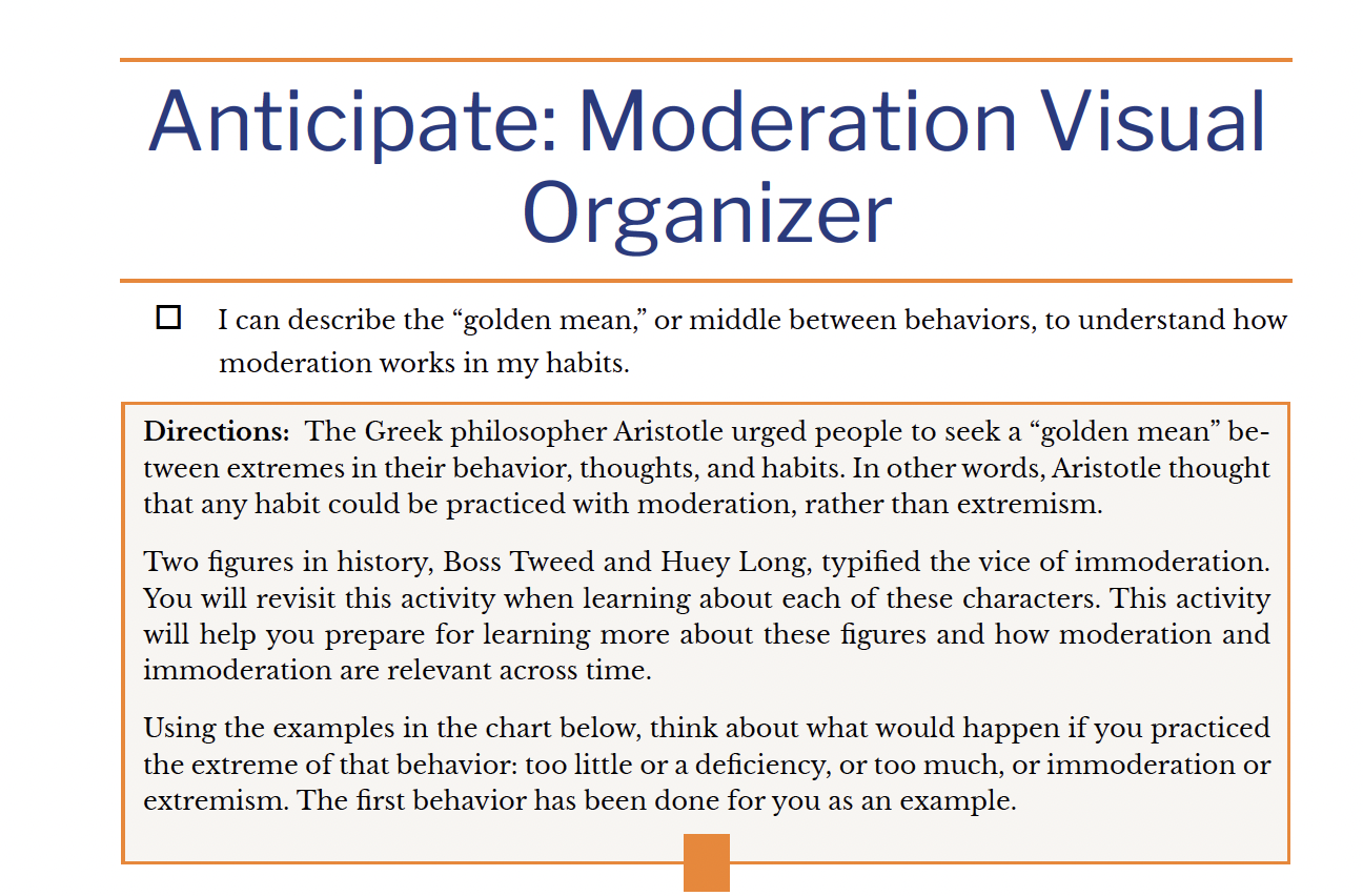 Two figures in history, Boss Tweed and Huey Long, typified the vice of immoderation. You will revisit this activity when learning about each of these characters. This activity will help you prepare for learning more about these figures and how moderation and immoderation are relevant across time.