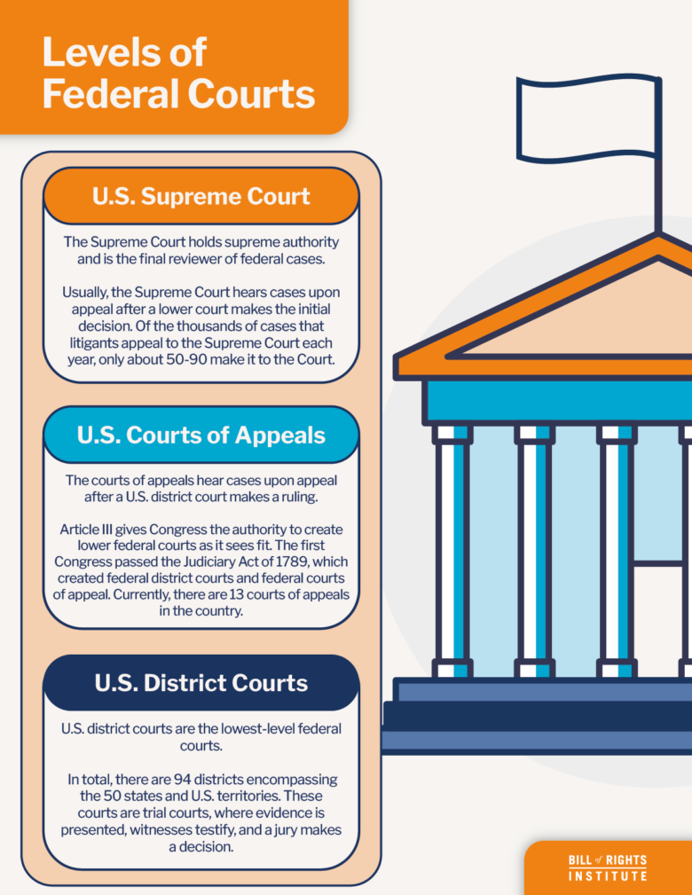 An infographic outlining the structure and jurisdiction of the three levels of federal courts: District Courts, Courts of Appeals, and the Supreme Court.