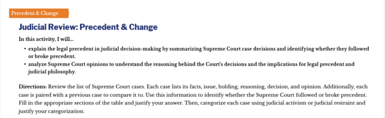 Directions: Review the list of Supreme Court cases. Each case lists its facts, issue, holding, reasoning, decision, and opinion. Additionally, each case is paired with a previous case to compare it. Use this information to identify whether the Supreme Court followed or broke precedent. Fill in the appropriate sections of the table and justify your answer. Then, categorize each case using judicial activism or judicial restraint and justify your categorization.