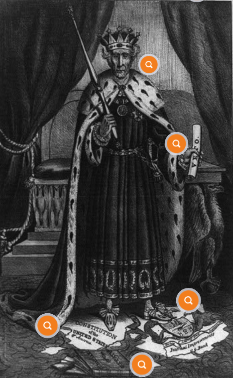 Page:Resources LibraryArrow iconCurriculum:Building a Self-Governing People: Civics & US History for Middle SchoolArrow iconUnit:Unit 6: America in Transition (1815-1860)Arrow iconLesson:The Presidency of Andrew JacksonKing Andrew Interactive Political CartoonAn interactive political cartoon of Andrew Jackson.