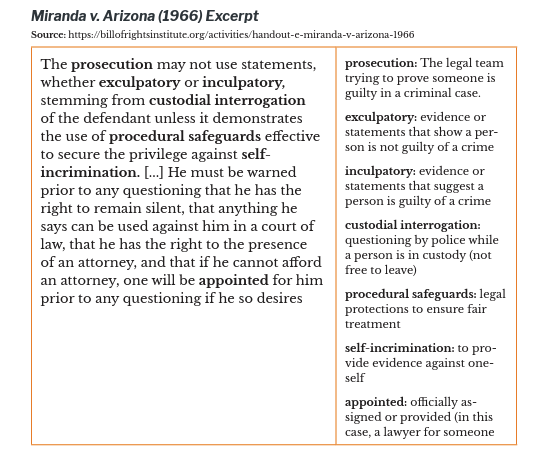 exculpatory: evidence or statements that show a person is not guilty of a crime inculpatory: evidence or statements that suggest a person is guilty of a crime custodial interrogation: questioning by police while a person is in custody (not free to leave) procedural safeguards: legal protections to ensure fair treatment self-incrimination: to provide evidence against oneself appointed: officially assigned or provided (in this case, a lawyer for someone who cannot afford one) |