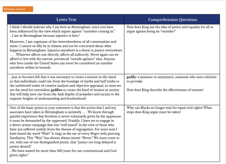 The text of the letter, plus background information, and comprehension and analysis questions.