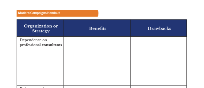 - I will be able to explain how various campaign organizations and strategies affect the election process.