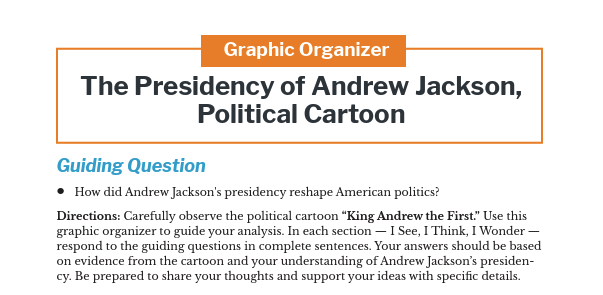 Directions: Carefully observe the political cartoon “King Andrew the First.” Use this graphic organizer to guide your analysis. In each section – I See, I Think, I Wonder – respond to the guiding questions in complete sentences. Your answers should be based on evidence from the cartoon and your understanding of Andrew Jackson’s presidency. Be prepared to share your thoughts and support your ideas with specific details.