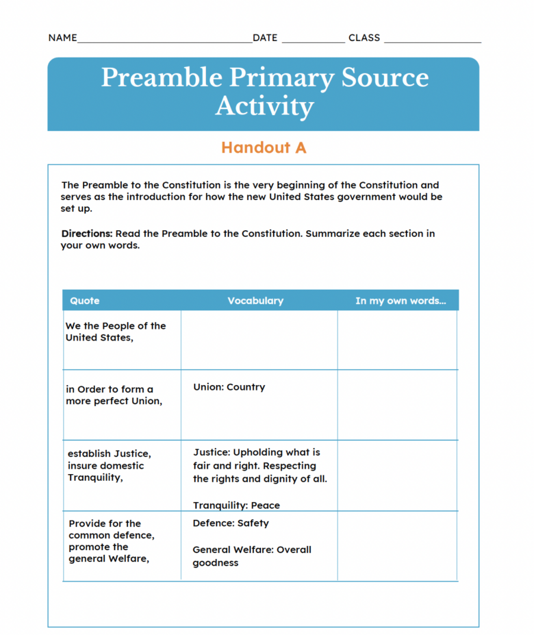 Page:Resources LibraryArrow iconCategory:ActivitiesPreamble Primary Source Activity | ElementaryScaffolded text of the Preamble to the Constitution to guide student understanding of it.More from this CategoryE LessonChecks and Balances | Elementary E-Lesson30 MinWhat are checks and balances and why do they exist?