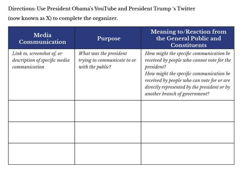 Directions: Use President Obama’s YouTube and President Trump ‘s Twitter (now known as X) to complete the organizer.