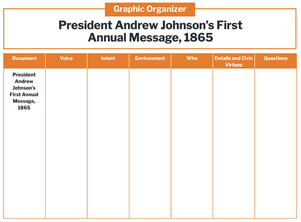 Page:Resources LibraryArrow iconCurriculum:Building a Self-Governing People: Civics & US History for Middle SchoolArrow iconUnit:Unit 9: Reconstruction (1865-1877)Arrow iconLesson:Assessing President Andrew Johnson’s First Annual Message, 1865President Andrew Johnson’s First Annual Message, 1865 Graphic OrganizerUnderstand President Andrew Johnson's goals for Reconstruction.P