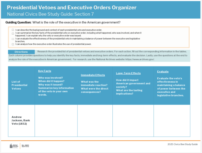 A graphic organizer to assist students in understanding background, context, and effectiveness of presidential vetoes and executive orders.