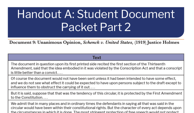 Excerpted text from the unanimous opinion of Schenck v. United States, application and reflection questions, and a thesis writing activity.
