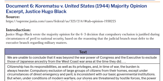 How did wartime experiences lead to challenges to the civil liberties Japanese Americans? This set contains the majority and dissenting opinions from the Korematsu v. United States Supreme Court Case and a 1983 White House Report to help students explore this question.