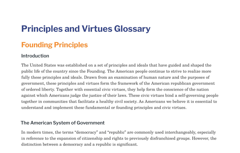 This list of principles and virtues is not meant to be comprehensive but instead to be a starting place for the investigation of the American experiment in self-government.