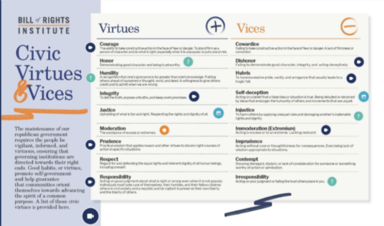 Page:Resources LibraryArrow iconCurriculum:Government and Politics: Civics for the American ExperimentArrow iconUnit:Unit 1: Foundation of American Self-GovernmentPrinciples and Civic Virtue TouchstoneAn interactive that helps students explore Founding Principles and Civic Virtues.