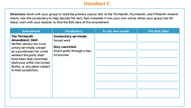 A scaffolded version of the Thirteenth, Fourteenth, and Fifteenth amendments that helps students understand the big ideas of these amendments.