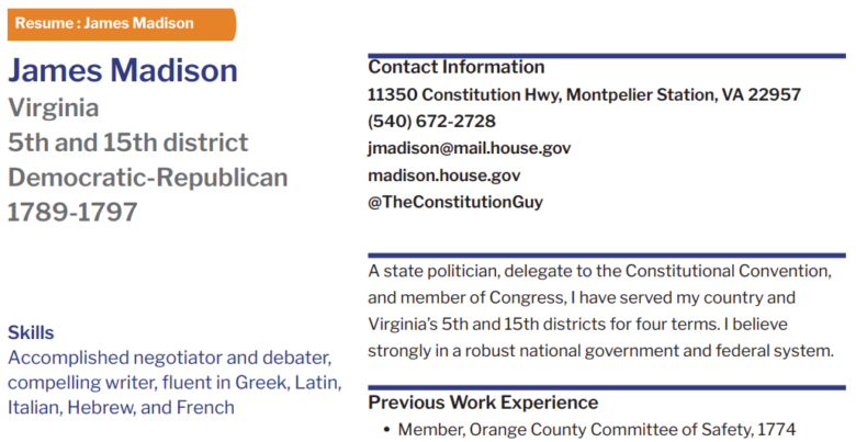 Page:Resources LibraryArrow iconCurriculum:Government and Politics: Civics for the American ExperimentArrow iconUnit:Unit 3: The Legislative BranchResume ExampleA fictitous resume of James Madison that illustrates how Congressional resumes work today.