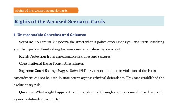 Explore the constitutional protections for individuals accused of crimes; each card presents a real-world situation, explains the relevant constitutional basis, and references key Supreme Court rulings.