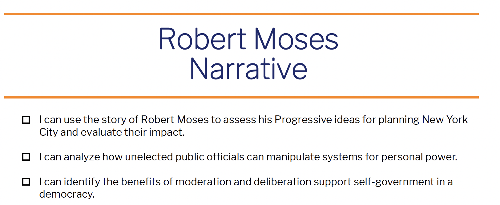 - I can use the story of Robert Moses to assess his Progressive ideas for planning New York City and evaluate their impact.