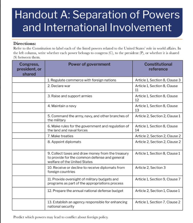 An activity to help students understand the powers of various branches of government in the realm of world affairs.