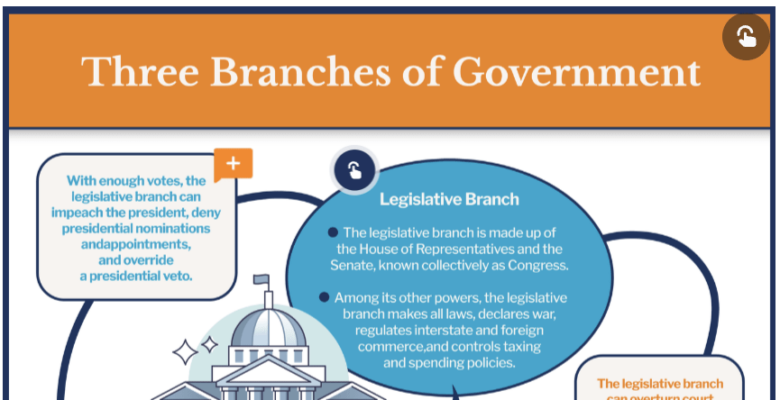Page:Resources LibraryArrow iconCurriculum:Government and Politics: Civics for the American ExperimentArrow iconUnit:Unit 1: Foundation of American Self-GovernmentSeparation of Powers and Major Responsibilities of Each BranchAn infographic that explains the responsibilities of each branch of government.
