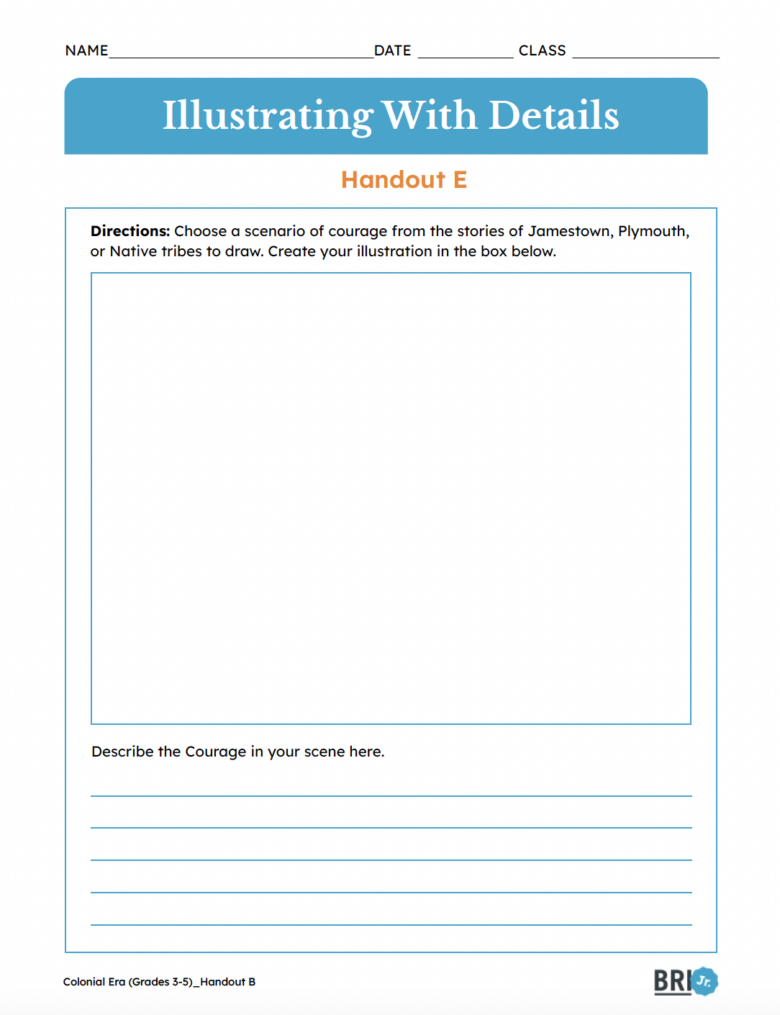A drawing activity that asks students to choose a scenario of courage from the stories of Jamestown, Plymouth, or Native tribes.